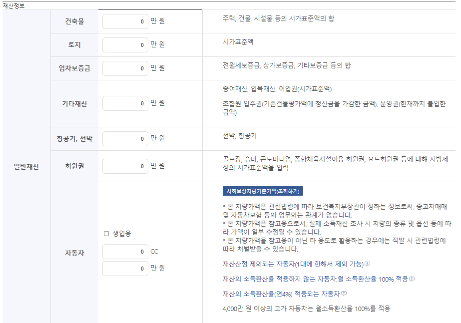 ▶ 자동차: 본인 명의로 된 자동차 배기량과 차량가액 입력